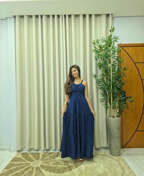 Vestido Longo de Alça Ajustável Liso Azul Marinho – Sol da Justiça
